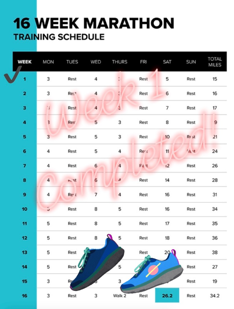I started week one after taking a couple of weeks off running and suffering from a three day killer migraine. I rarely get those, so it shook me a little. But I also didn’t want to get behind on my training. First week required 4 running days at 5 miles on Sat being the longest run. My goodness I am slow, but I did all of them without stopping with energy still to burn. I once read “It does not matter how slowly you go, as long as you don’t stop.” While I still want to work on reducing my time, I am proud of myself for slaying week 1! I also attended 4 boot camps this week. To be honest, my daily boot camp workout with my friends is one of my favorite parts of my day! I will keep those up as long as I can.